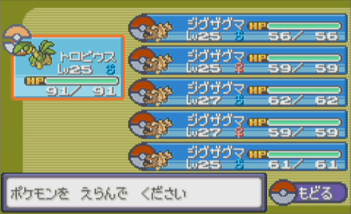 ・ 手持ちに1匹目を「トロピウス(レベル不問)」にして、技の順番を上から「命中100の攻撃技」、「あまいかおり」にする。
